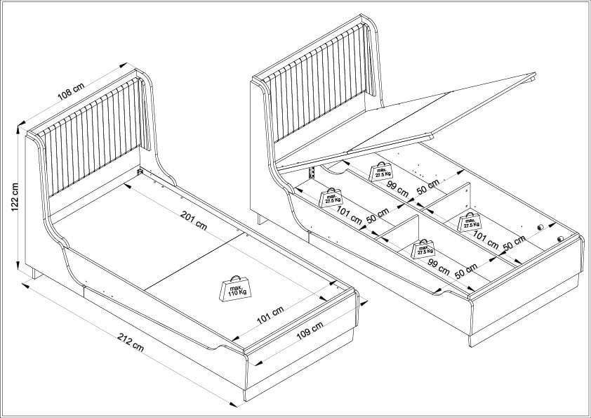• Bazalı Tasarım: Karyolanın altında bulunan bölmelere ayrılmış geniş saklama alanı, yatak odanızda ekstra depolama alanı yaratmanıza olanak tanır.