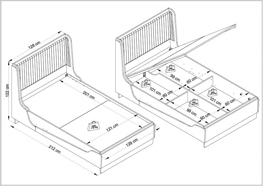 • Bazalı Tasarım: Karyolanın altında bulunan bölmelere ayrılmış geniş saklama alanı, yatak odanızda ekstra depolama alanı yaratmanıza olanak tanır.