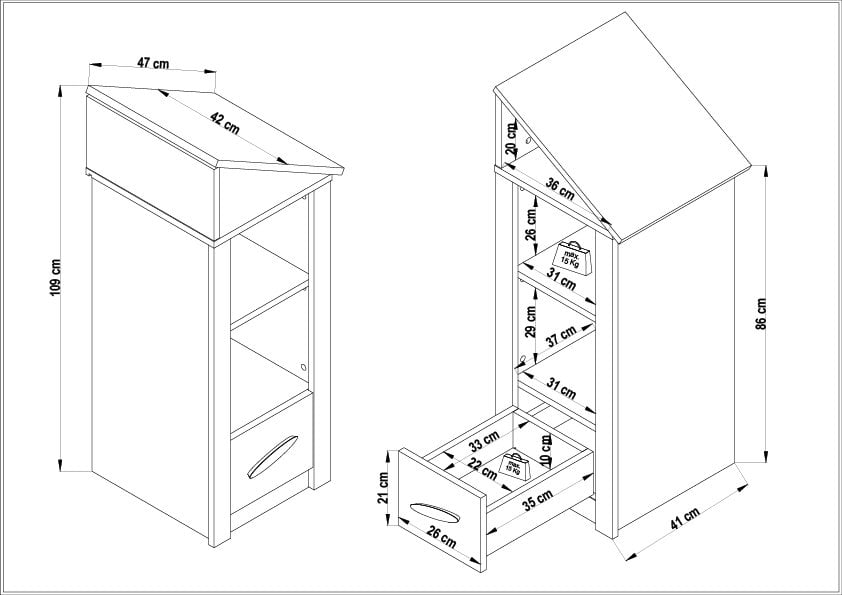 • Çekmece 18mm ve 8mm yonga levhadan oluşur, 25kg taşıyabilir