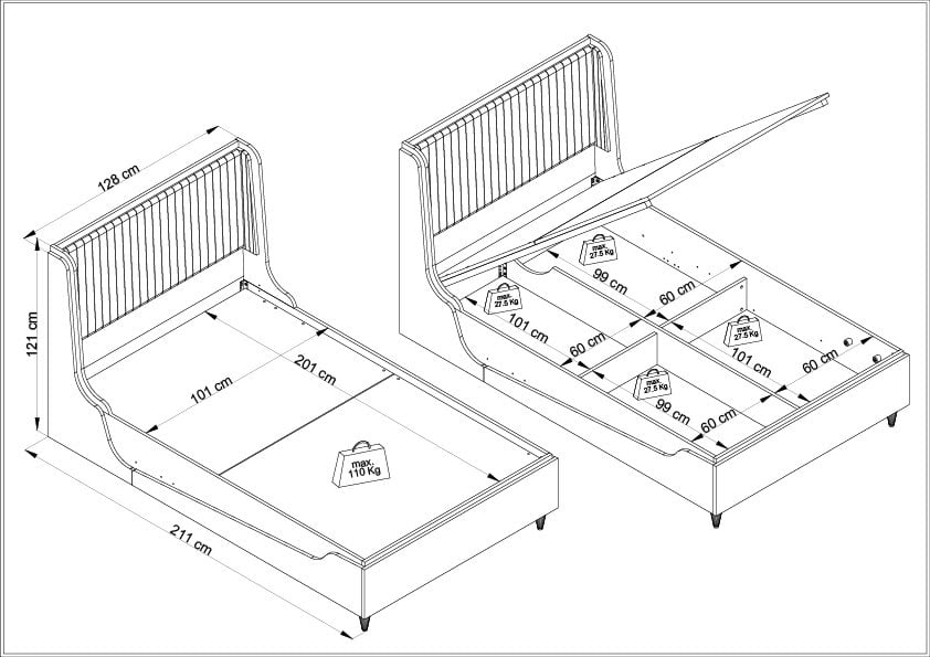 • Bazalı Tasarım: Karyolanın altında bulunan bölmelere ayrılmış geniş saklama alanı, yatak odanızda ekstra depolama alanı yaratmanıza olanak tanır.