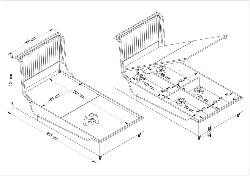 • Bazalı Tasarım: Karyolanın altında bulunan bölmelere ayrılmış geniş saklama alanı, yatak odanızda ekstra depolama alanı yaratmanıza olanak tanır.
