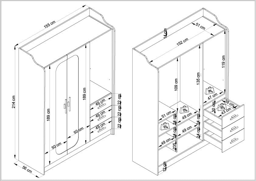 Dayanıklı Raflar ve Çekmeceler: Dolap rafları 25kg'a kadar ağırlık taşıyabilir ve ihtiyaca göre çıkarılıp takılabilir. Çekmeceler 18mm ve 8mm yonga levhadan oluşur ve 25kg taşıma kapasitesine sahiptir.