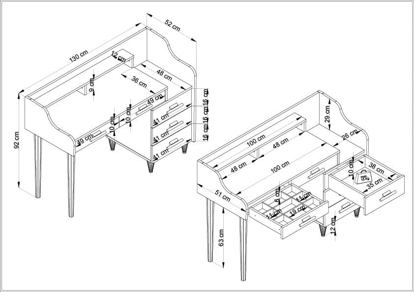 • Çekmece ve Raflar: Makyaj masasının 5 çekmeceli ve raflı yapısı, geniş bir saklama alanı sunar. Bu sayede tüm kişisel eşyalarınızı düzenli bir şekilde saklayabilirsiniz. Dar çekmecelerde kullanılan teleskopik ray sistemi, çekmecenin dip tarafına kolayca erişmenizi sağlar. Geniş çekmecelerde kullanılan frenli ray sistemi, çekmecelerin sessiz ve güvenli bir şekilde açılıp kapanmasını sağlar.